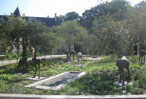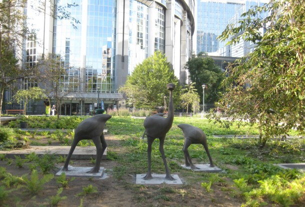 Dans le cadre du projet de réaménagement d'entrées du Parc Léopold en vue de l'ouverture de la maison de l'Europe, des autruches ont été installées aujourd'hui près de l'entrée de la rue Wiertz. Objectif : égayer l'ilôt de verdure qui accueille les systèmes de ventilation de la jonction Nord-Midi en sous-sol mais surtout faire un clin d'oeil au jardin zoologique qui se trouvait là autrefois.