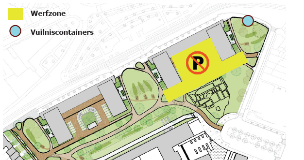 De bewoners worden verzocht hun vuilniszakken achter te laten op het inzamelpunt aangeduid op de kaart. Wij danken u alvast voor uw begrip en uw geduld tijdens dit tijdelijk ongemak.