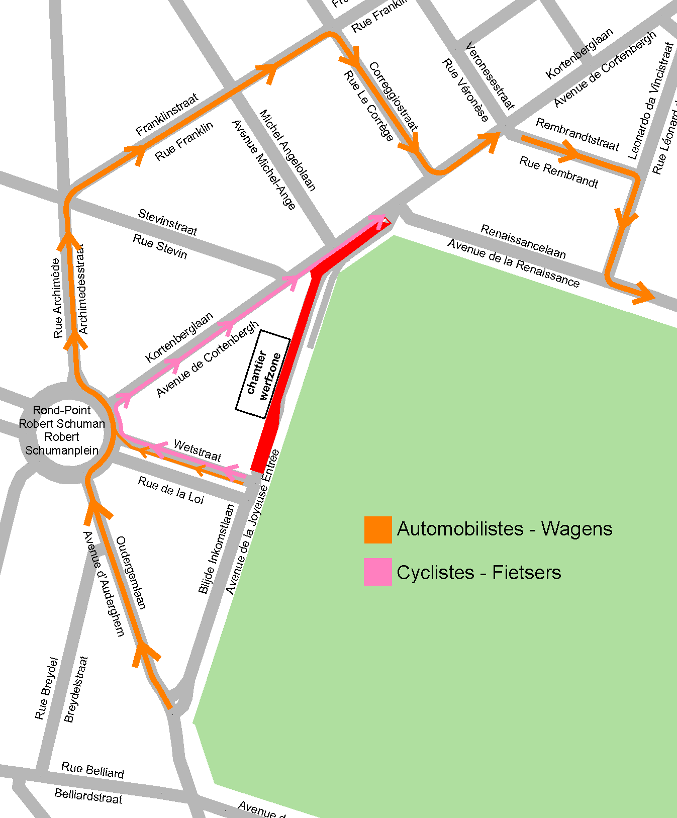 - Voor fietsers: omleiding via de Wetstraat, de rotonde en de Kortenberglaan (zijstrook tegen het verkeer in);