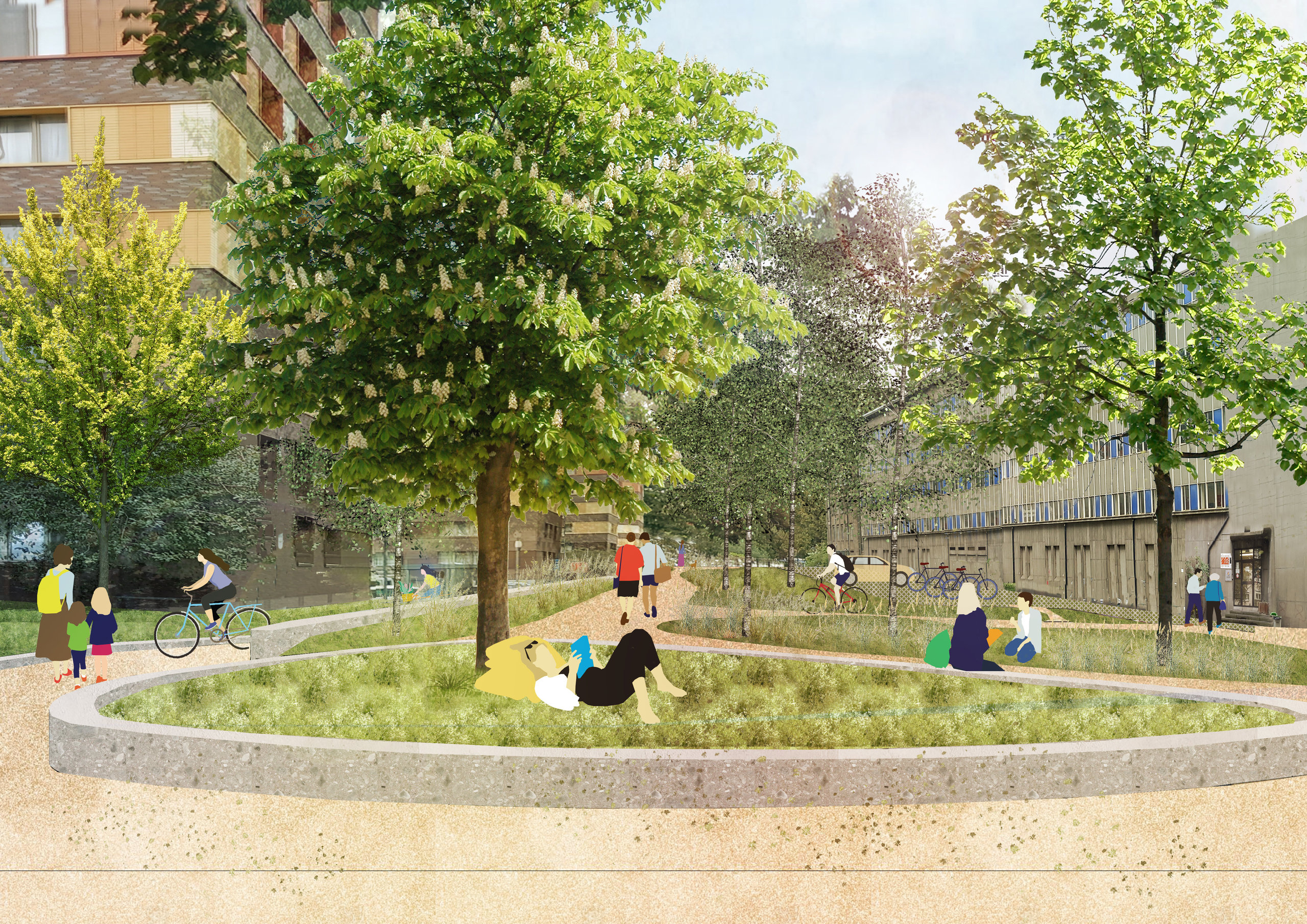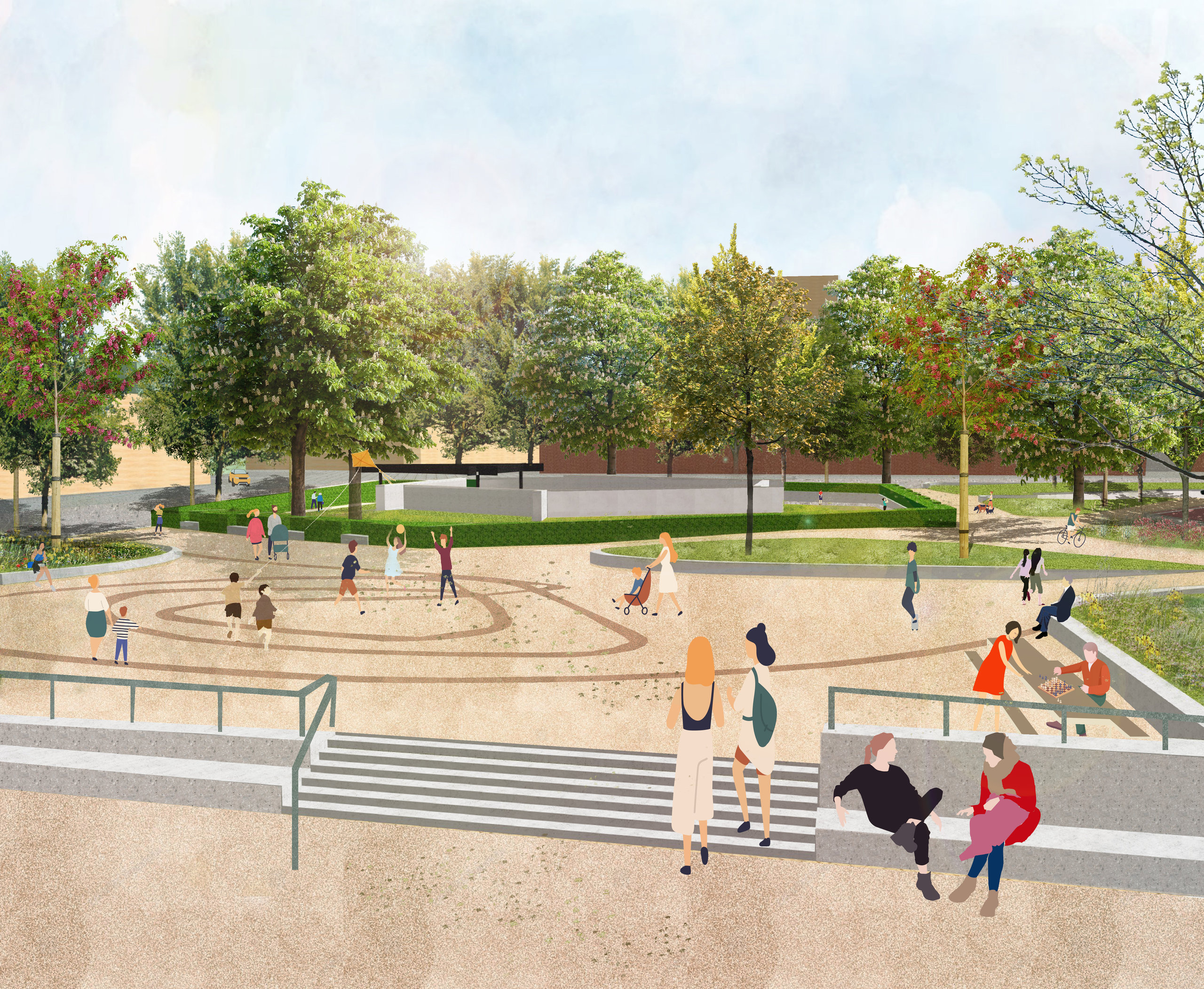 Studiebureaus Dessin et Construction, AAC Architecture en CSD Ingénieurs ontwierpen het park rond een wandelpad dat toegankelijk is voor voetgangers, mensen met beperkte mobiliteit en fietsers. Het verbetert de verbinding tussen de verschillende gebouwen in de wijk en creëert tegelijk een aangename omgeving voor wandelaars en voorbijgangers.