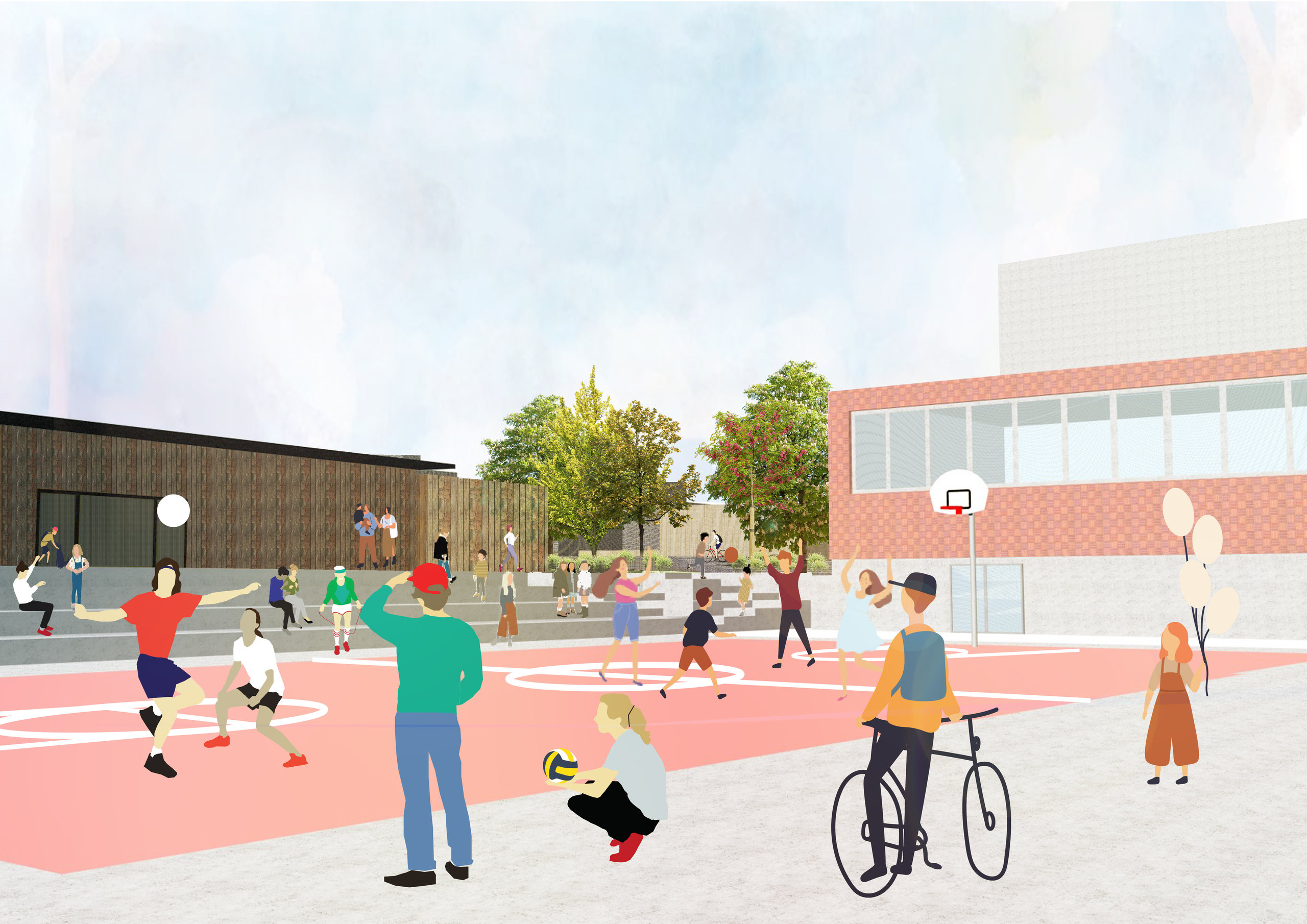 Verder voorziet het project een speelplein, een multisportterrein, een speelzone voor de allerkleinsten nabij de crèche en een picknickzone in een grote tuin tussen de twee sociale woonblokken.