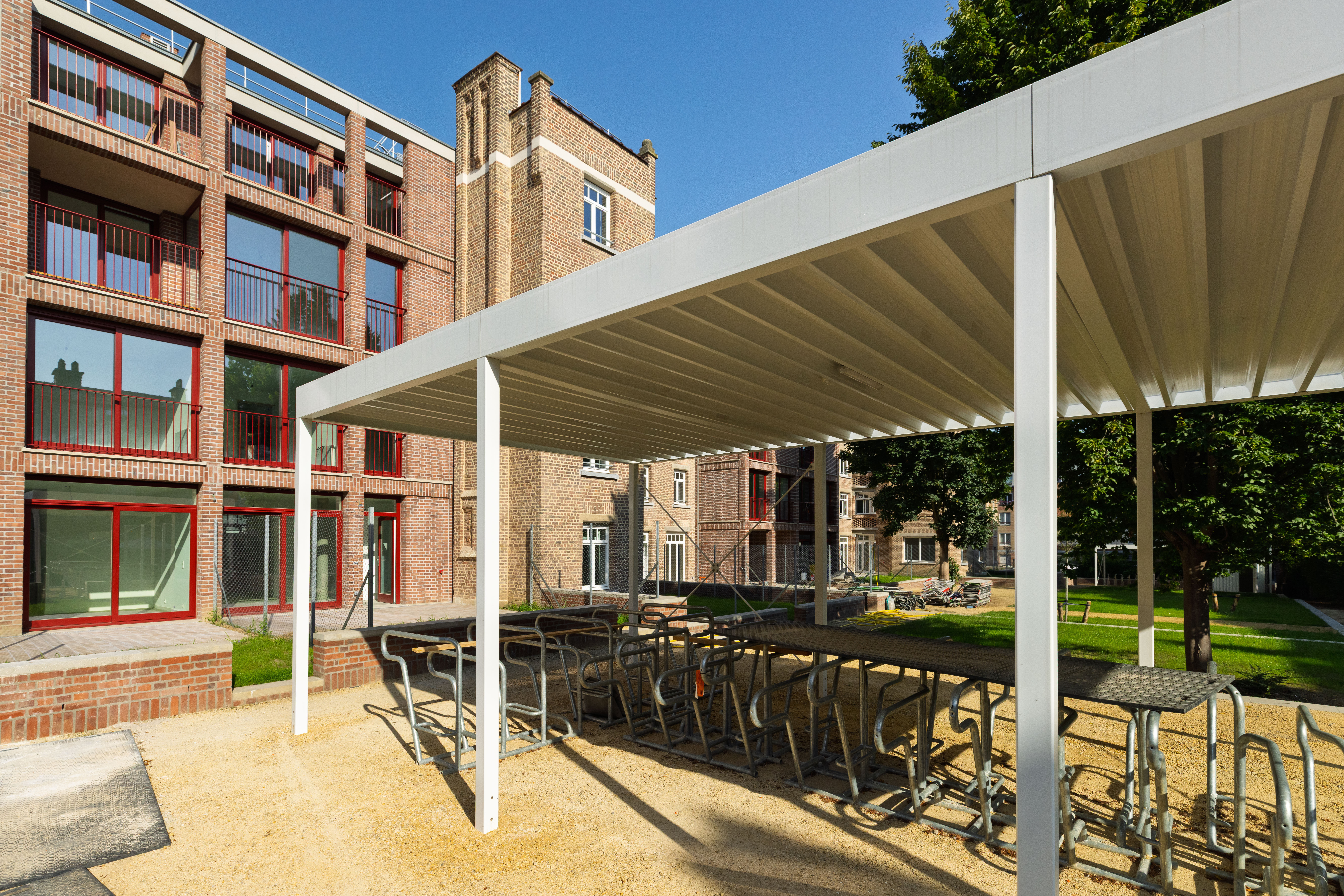 Ce complexe d’habitations fait partie de la Cité Volta, un ensemble de logements sociaux conçu vers 1925 par l'architecte Joseph Caluwaers. La façade caractéristique en briques constitue une partie importante du patrimoine architectural ixellois. Les façades ont été restaurées et les extensions arrière ont été conçues dans le respect du travail originel de l'architecte, en collaboration avec la Commission royale des Monuments et des Sites. Une attention a été portée à l'utilisation de la brique originelle et au respect de la verticalité de l’édifice. Le jeu de surfaces ouvertes et fermées, souligné par le relief, confère à l'extension un caractère à la fois unique et contemporain.